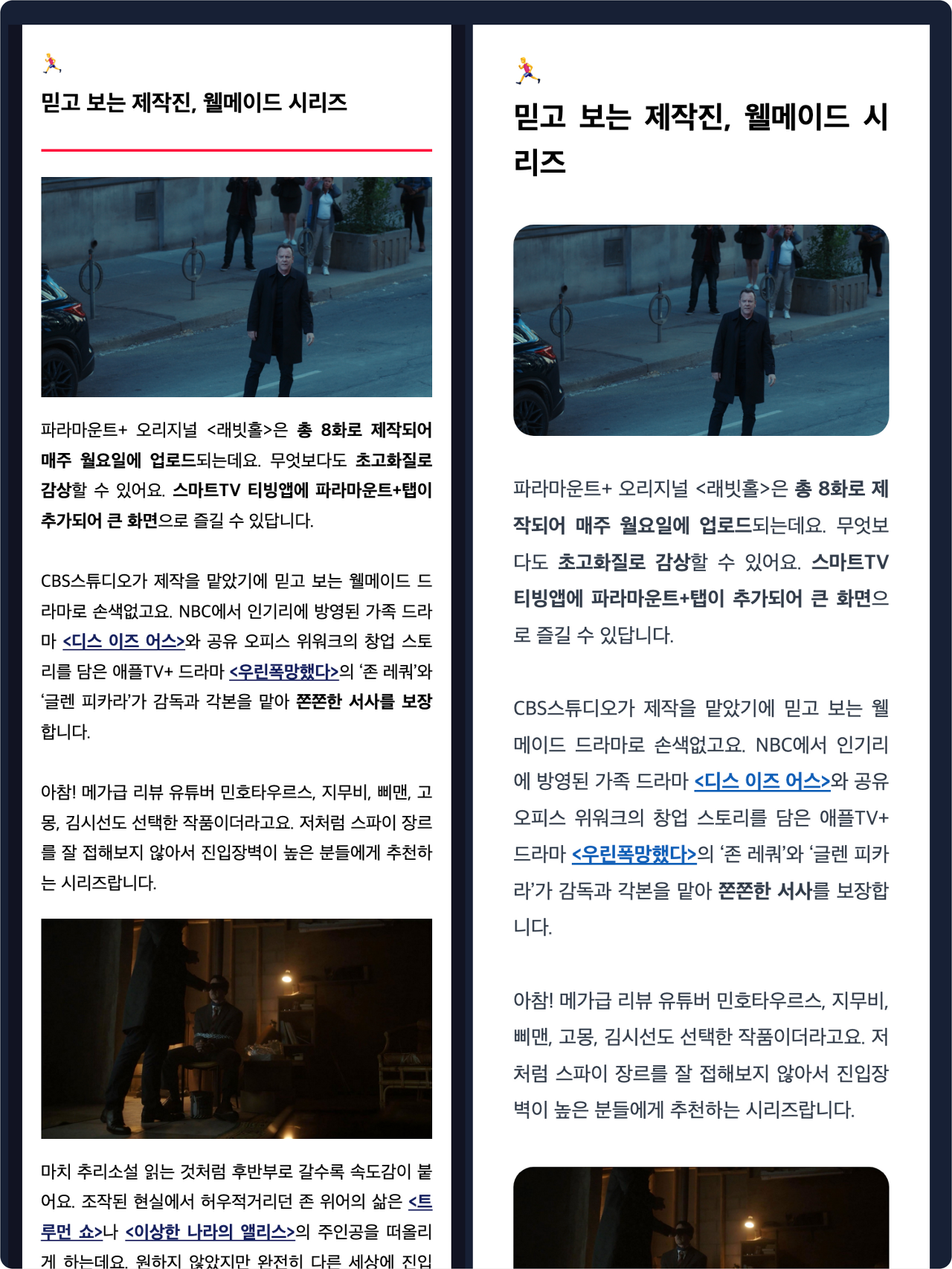 키노라이츠에는 다양한 아티클 콘텐츠를 제공한다. 그동안은 스티비 뉴스레터 툴을 이용해 UI를 구성하고 아티클을 발행해 왔는데 아무래도 뉴스레터 포맷에 최적화되어있다 보니 모바일 가독성이 떨어지는 아쉬움이 있었다. 모바일 가독성을 높이는 것을 목표로 스타일을 재구성해 실제 서비스 적용까지 성공했다.