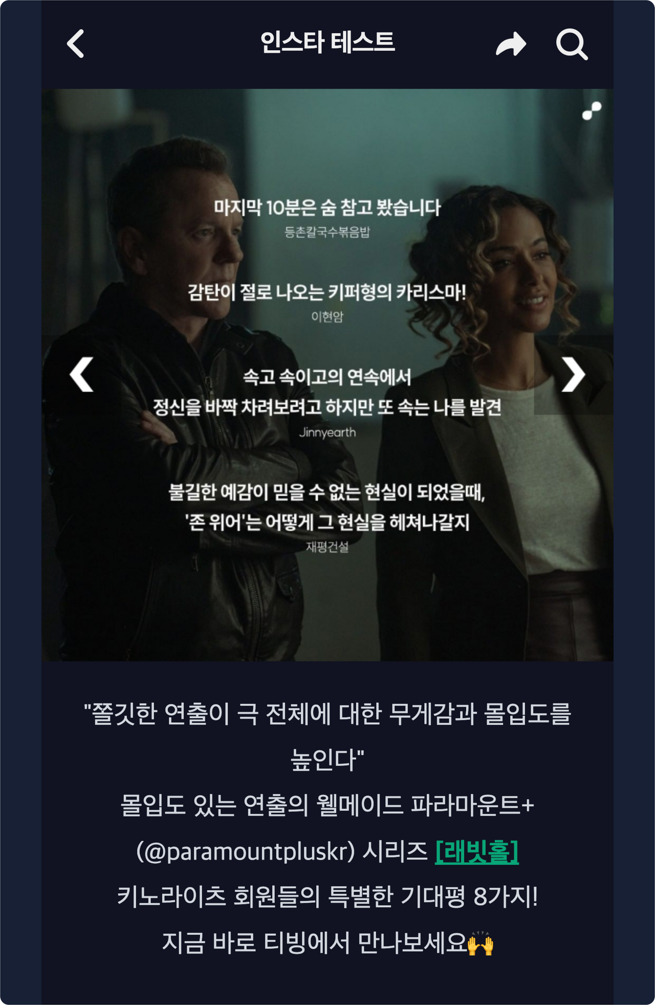 마케팅 팀에서는 인스타그램 채널도 활발히 운영하고 있다. 아티클과 달리 인스타그램은 조금 더 가벼운 콘텐츠로 위트 있게 운영 중인데 이 콘텐츠가 인스타그램에서만 소비되는 게 아쉬워서 키노라이츠 플랫폼 안으로 가져오고 싶었다.