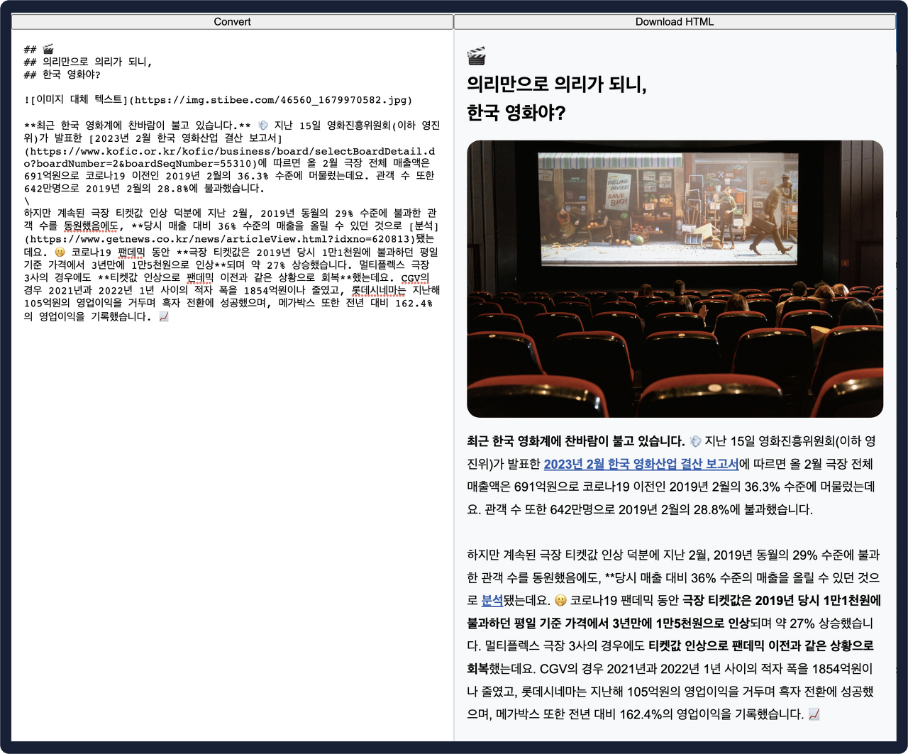 이제는 조금 더 욕심내서 마크다운 에디터를 만들어보고 싶어졌다. html과 css를 잘 모르더라도 마크다운 형태로 텍스트를 입력하면 자동으로 디자인 스타일이 입혀져서 결과물이 나오게 만들고 싶었고 현재는 70% 정도까지 진행되었다.