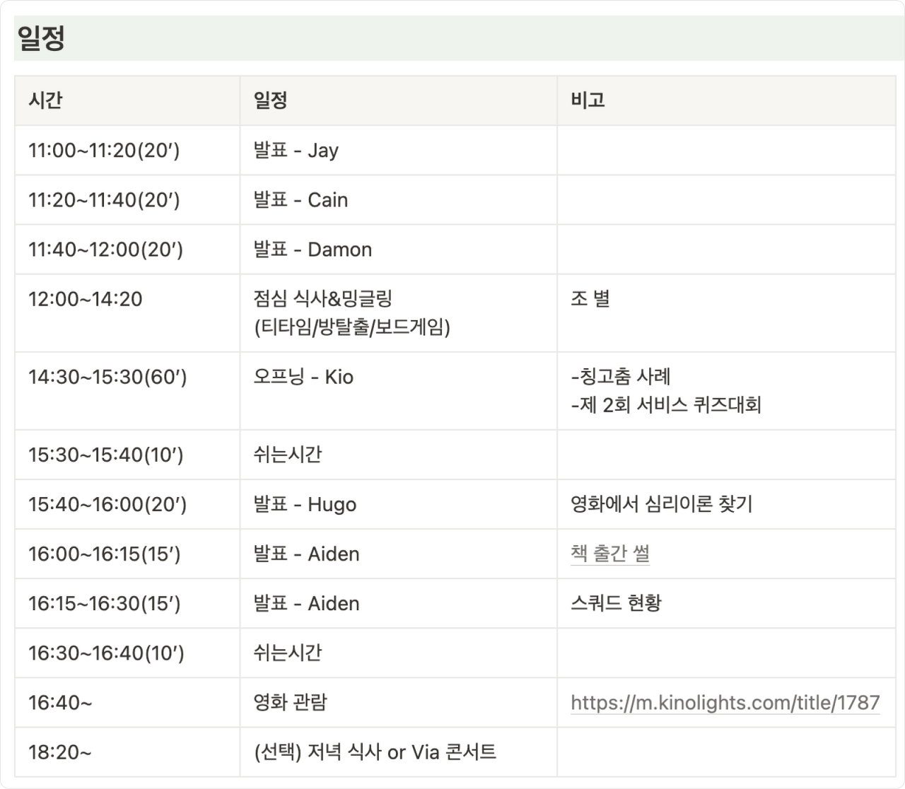 이후 칭고춤(칭찬은 고래를 춤추게 한다) 세션에서는 서로가 칭찬한 일들을 공유하고, 우리 서비스에 대한 이해도를 높이기 위한 전체 퀴즈대회, Hugo의 영화 장면에서 보는 심리이론 찾기, Aiden의 스쿼드 발표 및 책 출간 이야기들을 공유하고 나누었다. 마지막 타임은 다 함께 영화를 관람하고 마무리한다.