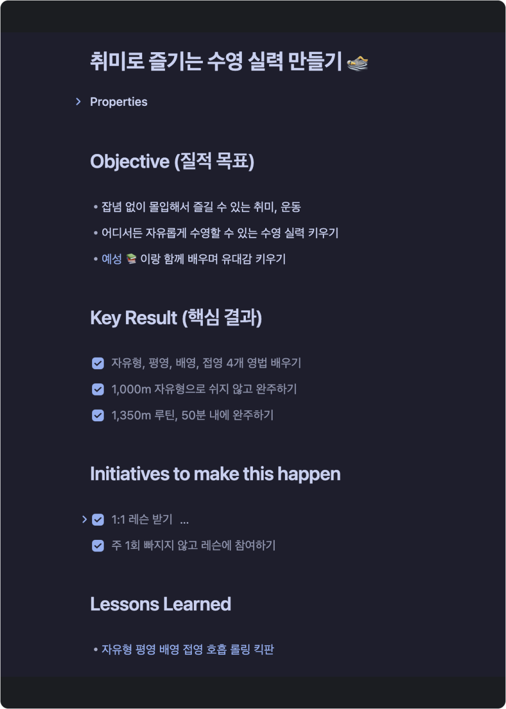 작년 10월부터 수영을 배우기 시작했는데 이런 식으로 OKR을 계획한다.