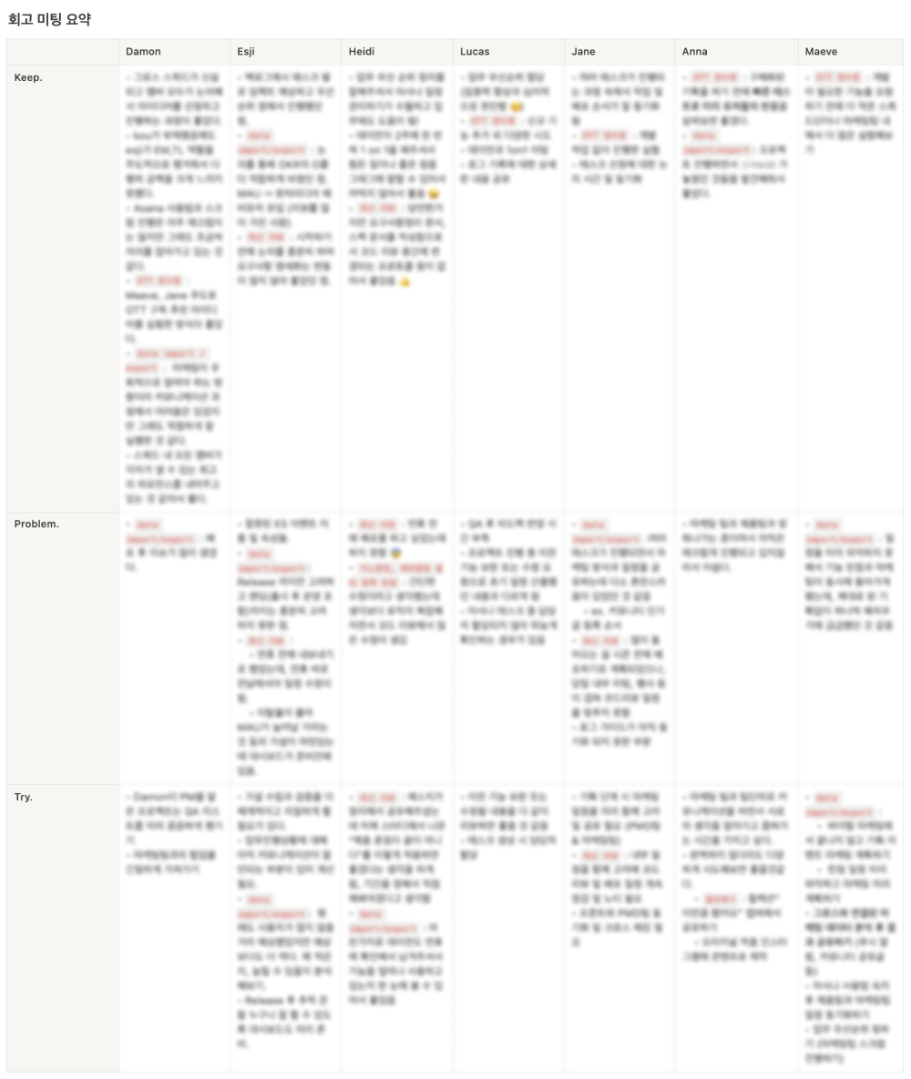 이번 스쿼드에서는 처음으로 손발을 맞춰보는 멤버들이 많았는데 회고 미팅에서의 협업 경험은 대부분 긍정적이었다. 회고 미팅에서 나온 Action Item 은 5개로 그중 2개를 공개하면 다음과 같다.
