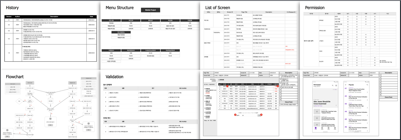 프로젝트 킥오프 이전에는 제안서, 사업계획서 등의 문서 작업을 하기도 하고, 프로젝트 킥오프 이후에는 IA(information architecture), 기능 정의서, 요구사항 정의서, 정책 정의서, 스토리보드, 일정 관리, 검수 계획서 등의 문서를 작성합니다.