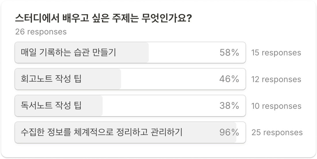 사전 신청 페이지에서 스터디에서 배우고 싶은 주제를 투표 받았는데 제가 이번 클래스에서 주력으로 해보려고 생각했던 <회고 기록>, <독서 기록> 대비 <수집한 정보를 체계적으로 정리하고 관리하기>에 관심이 압도적으로 많으셔서 커리큘럼은 이 방향으로 조금 더 포커스를 두고 진행해보려고 합니다.