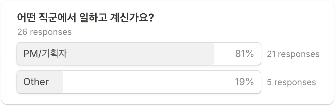 직군은 PM/기획자가 81%, 기타 직군이 19%입니다.